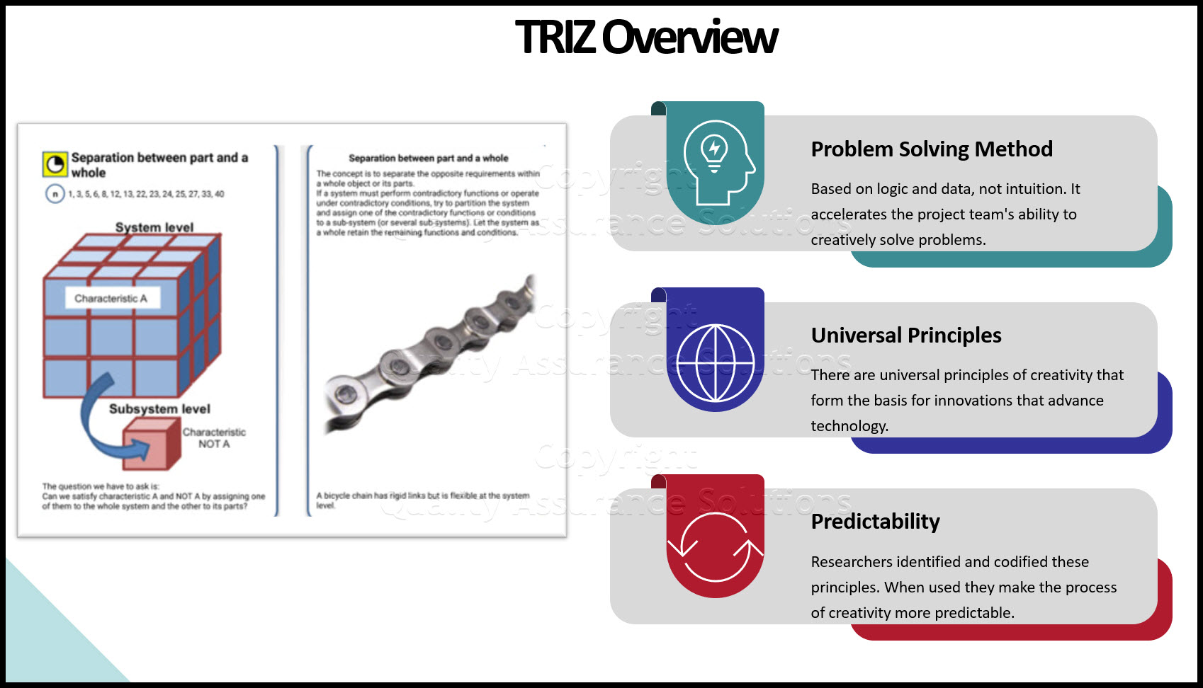 Triz is a problem solving method based on logic and data, not intuition. It accelerates the project team's ability to creatively solve problems.